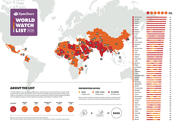 Published by Open Doors, The World Watch List is an annual ranking of the 50 countries where Christians face the most extreme persecution. The methodology measures violence against Christians and pressure across six spheres of life: private life, family life, community life, national life, church life, and violence. Rankings are based on verified reports collected during a 12-month research period ending September 30, 2025.